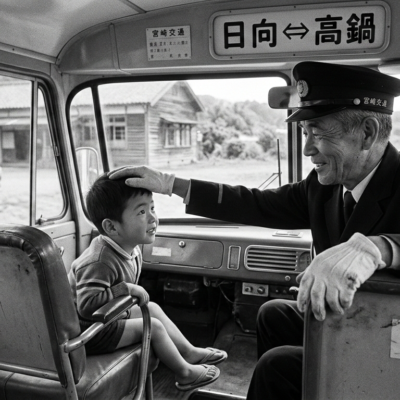 私は小さいころ(5歳頃)、病院の前でよく遊んでおりました。当時も宮崎交通のバスが日向から高鍋まで通っておりました。そのバスの運転手さんに大変優しい方がおられました。日向から高鍋まで1日何本か通っておりました。ある日病院の前で遊んでいるとバスを止められて、運転手さんが私を抱っこしてバスに乗せてもらい一番前の席に座らせてそのまま高鍋まで連れていかれたことがありました。今だったら、だまって 子供を車に乗せて連れて行くなど、大変な大騒ぎになることでしょう。当時は子供も多く、今みたいに心配がなかったのでしょうが、私は小さかったので途中ですっかり気持ちがよくなって寝込んでしまい、目が覚めて気が付いた時には高鍋の終点車庫の中でした。ひとりで寂しくしておりますと、運転手さんが来て「ぼん、おなかかすいただろう」と自分の弁当の中からご飯を分けてくださって、おいしく食べたことがありました。その後バスは日向行きで、自宅に連れて帰ってもらいました。当時、子供が急にいなくなっても現在のように大騒ぎになることはなかったのでしょう。家に帰っても家族はさほど心配はしていなかったようでした。